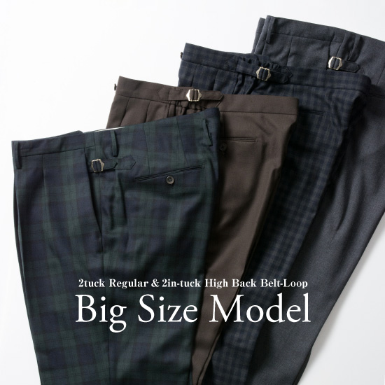 【Big Size】2 in-tuck High Back Belt-Loop Model 【BCMG66-63】 Black Watch W50%P50% SOLOTEX Saxony Stretch 裾未処理品 【春夏秋商品】